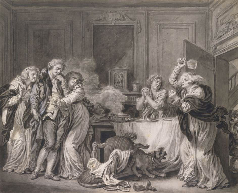 Jean Baptiste Greuze, La Femme en colère, vers 1785. Pinceau, lavis noir et gris, réhaussée de blanc, sur des traces de graphite, 52,1 x 64 cm. The Metropolitan Museum of Art, New York © GrandPalaisRmn (The Metropolitan Museum of Art) / Image of the MMA.