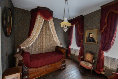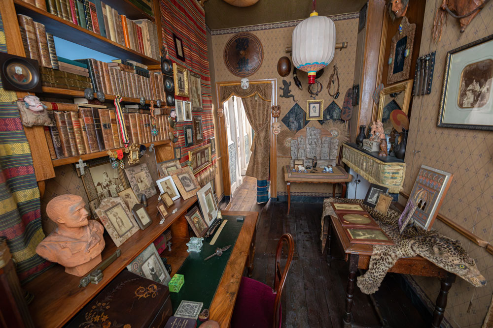 Dès son plus jeune âge, Julien (alias Pierre Loti) a fait preuve d’inventivité et de talent artistique, dessinant et créant des figurines de théâtre (exposées dans une vitrine avec d’autres objets hétéroclites tel un cabinet de curiosités). Son premier roman, Aziyadé, est publié en 1879, sans nom d’auteur. Viennent ensuite le Roman d’un spahi (1881), Mon frère Yves (1883) ou encore Pêcheur d’Islande (1886), signés Pierre Loti. Il est élu à l’Académie Française en 1891, à l’âge de 41 ans, face à Zola. Hanté par l’angoisse de la mort et porté aux rêves et aux souvenirs, sa maison de Rochefort (acquise par son grand-père maternel en 1802 et qu’il rachète à sa mère en 1871) va devenir son nouvel horizon. En 1895, il lance les grands travaux de la maison. Et pour assouvir ses folies créatives et son goût pour les ailleurs, il achète même en 1895 et 1897 les deux maisons mitoyennes. Il réunit en partie les habitations, perce des murs, ajoute des fenêtres, abat des cloisons...Tout cela sans plan, sans archives, mais surtout au mépris des règles élémentaires de l’architecture…Ce qui, au fil des années, s’avèrera problématique pour la solidité de la structure.