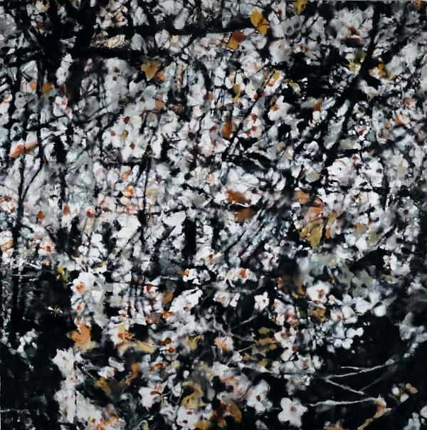 Dans les mêmes années, Cognée se frotte au quotidien pour fixer l’instant, l’éphémère. « Peindre pour sauver de l’oubli » est d’ailleurs titrée cette section de l’exposition. Ses toiles montrent, comme « filtrés » par le temps, sa femme et ses fils sur la plage, des natures mortes de chambres d’hôtel et de tables dressées… Des apparences ou des apparitions ? Il inaugure dans cette période deux techniques qui seront désormais sa marque de fabrique : des petites photographies recouvertes de peinture (deux cents photographies de Sans titre, 1997) et la technique de l’encaustique et du fer à repasser (*). Cognée s’engage alors, et jusqu’à aujourd’hui, totalement dans « l’épreuve du temps », représentant son travail d’usure ou d’effacement sur les être comme sur les choses : façades d’immeubles (les 32 pièces de Sans titre, 1997-2024 ou Traverser la ville 1 et 2, 2024), châteaux de sable, fleurs (Amaryllis 1, 2, 3, 2022).